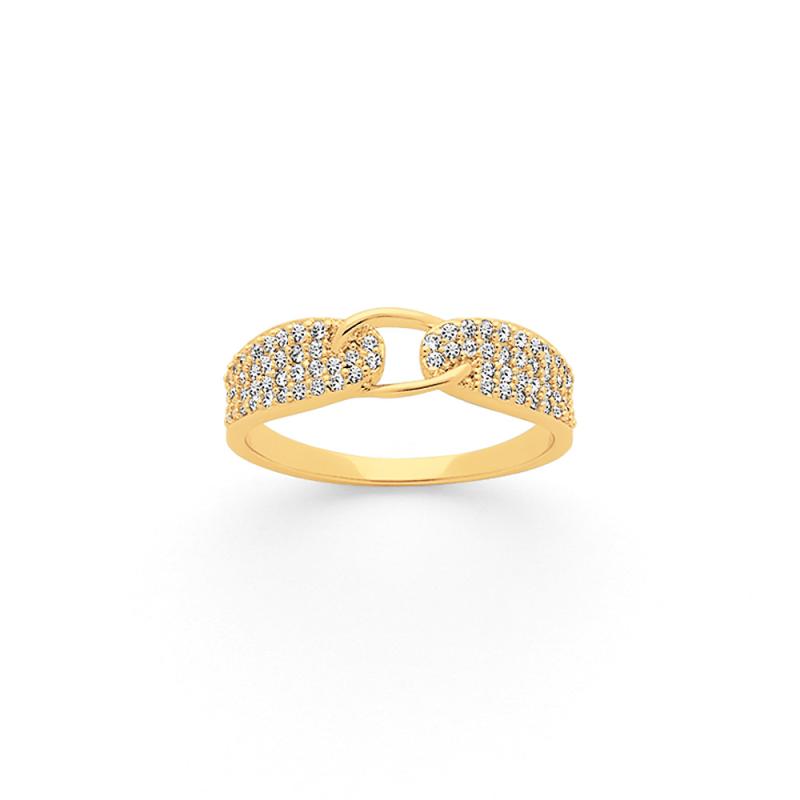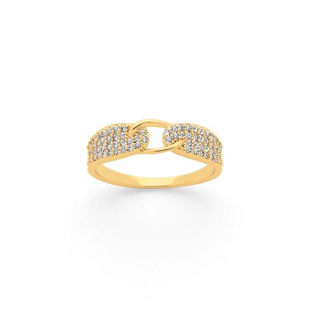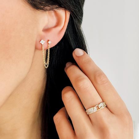 La bague en plaqué or avec zirconias de la collection Symbiose est resplendissante. Son design avant-gardiste, mis en exergue par le pavage éblouissant des zirconias, fait de cette bague un bijou à part. En portant cette bague, vous serez unique. Elle est disponible en plusieurs tailles, de 50 à 64.