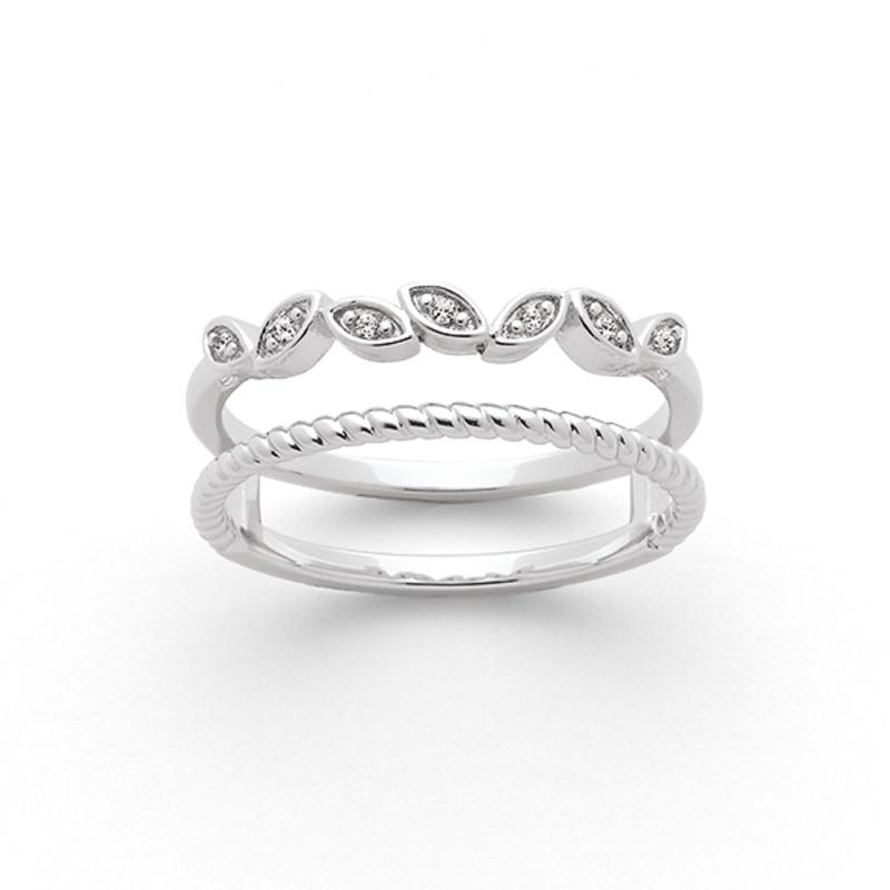 Romantique à souhait cette bague deux en une saura vous séduire. Ses deux anneaux parallèles sont différents et pourtant ils se complètent à la perfection. Le premier anneau finement ciselé met en valeur le second formé d'une succession de petites feuilles serties de zirconias. Cette bague est proposée de la taille 50 à 62.