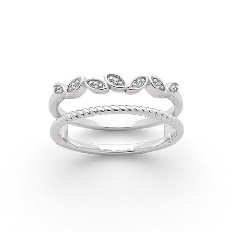 Romantique à souhait cette bague deux en une saura vous séduire. Ses deux anneaux parallèles sont différents et pourtant ils se complètent à la perfection. Le premier anneau finement ciselé met en valeur le second formé d'une succession de petites feuilles serties de zirconias. Cette bague est proposée de la taille 50 à 62.