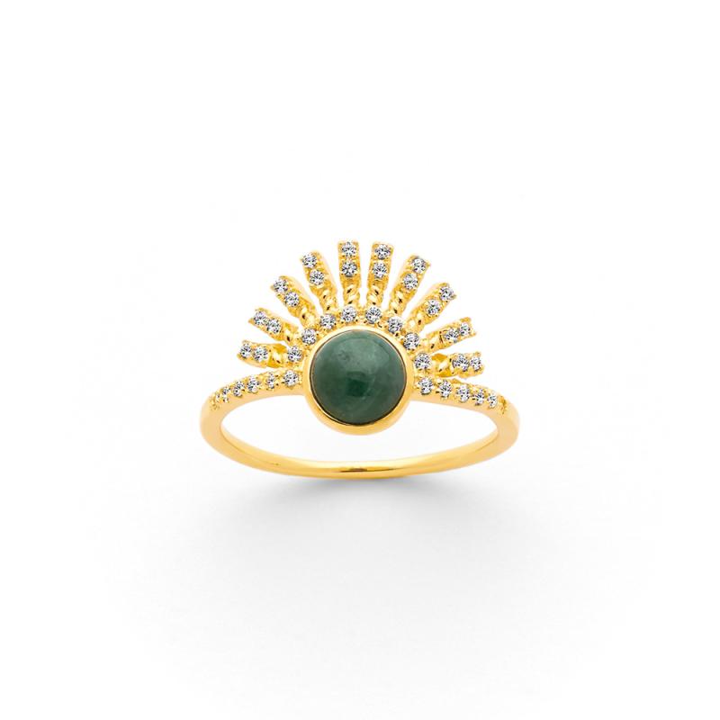 Mettez du soleil dans votre vie avec cette bague en plaqué or. La forme originale et atypique de cette bague apportera de la joie dans votre quotidien et fera disparaître la morosité ambiante. Le jade vert, couronné de zirconias embellira vos journées d'été. Cette bague est disponible de la taille 52 à 60.