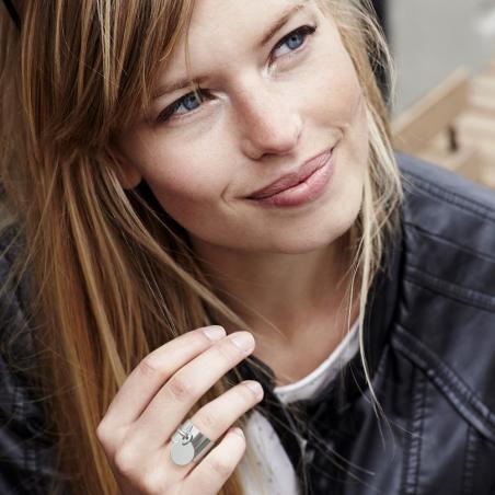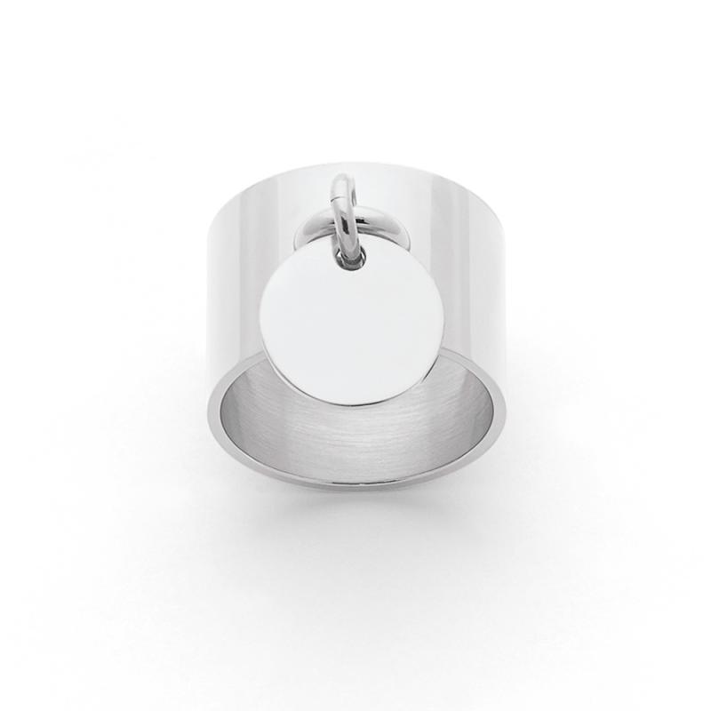 Cette large bague en acier sera incontestablement une pièce forte de vos accessoires. La pastille fixée sur l'anneau lui permettant de bouger fait toute l'originalité de cette bague. Elle est disponible de la taille 50 à 64.