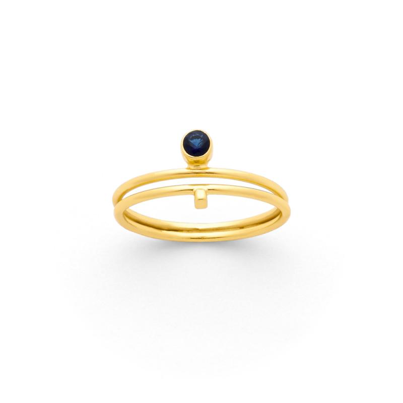 Cette bague dorée de la collection Solstice est ornée d'un quartz bleu en serti clos. Cette pierre représente la pureté et l'infini. Elle aurait des vertus purifiantes et apaisantes. La forme de la bague fait de ce bijou un accessoire original, adapté à toutes. Elle est disponible en plusieurs tailles de 50 à 60.