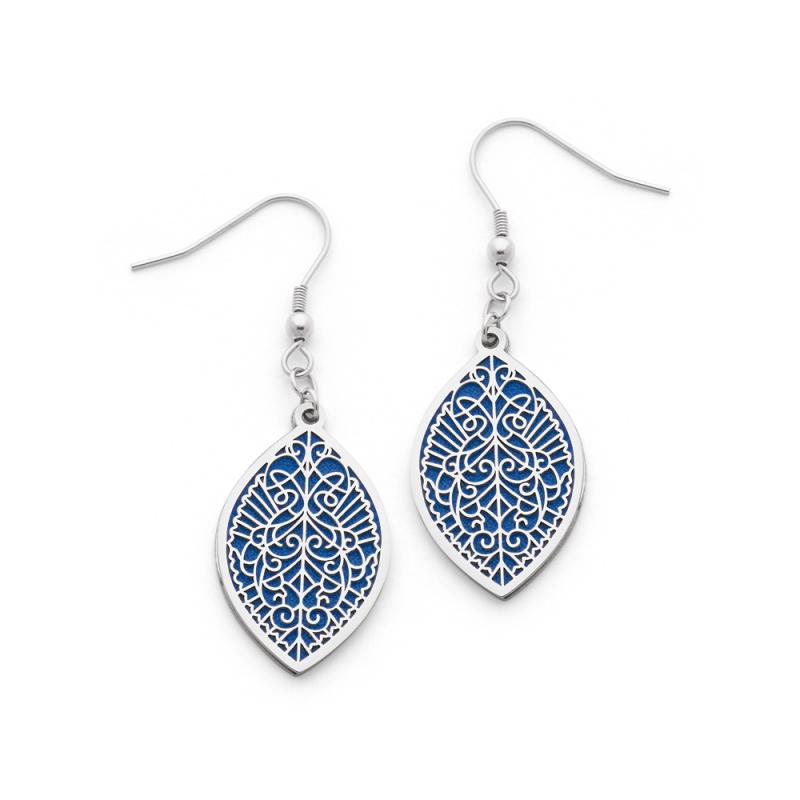 Retrouvez tout l'esprit méditerranéen dans cette paire de boucles d'oreilles en acier. Le travail très délicat de l'acier à l'intérieur des boucles est mis en valeur par le fond bleu du cuir d'imitation. Les crochets de ces boucles d'oreilles vous permettent de les mettre et de les retirer facilement.