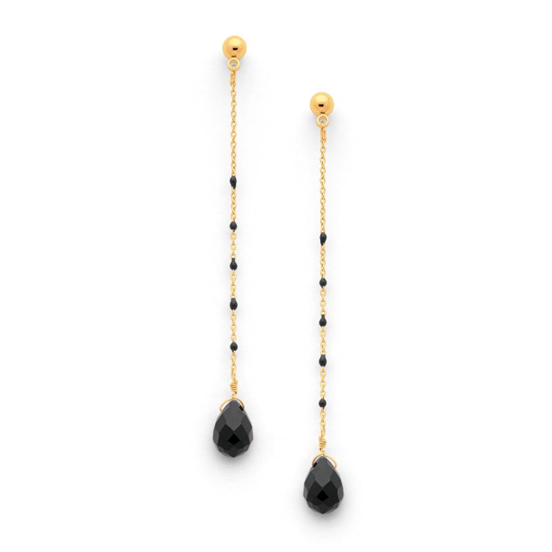 Ces boucles d'oreilles en acier doré sont ornées, d'une magnifique pierre volcanique. L'obsidienne est une gemme symbolisant le plus souvent la justice. La finesse de ce bijou accentuera votre élégance et votre sensualité. Pour compléter votre parure, vous pouvez aussi porter le collier de la même collection.