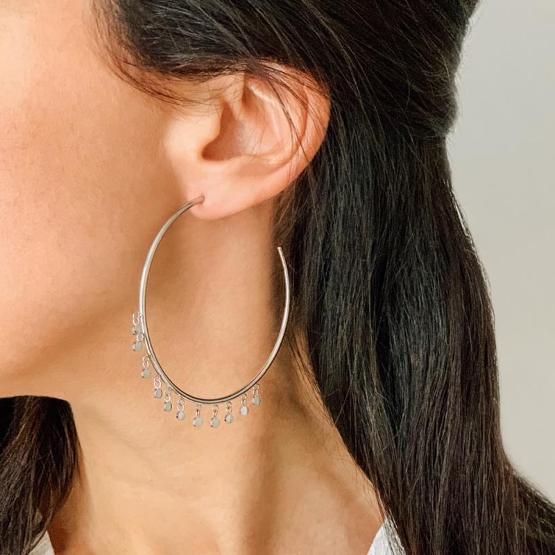 Osez la tendance XXL avec ces créoles de 58 mm de diamètre. Imposantes, mais très féminines, ces créoles de la collection Elise donneront à votre journée de la fantaisie. Les petites pampilles suspendues aux boucles d'oreilles contribueront à votre bonne humeur en bougeant au même rythme que vous.