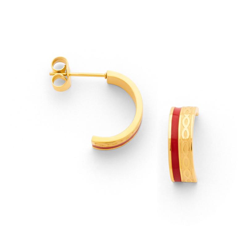 Les boucles d'oreilles en acier doré de la collection Ariane ont une forme classique et élégante en forme de demi-créoles. Le détail en émail rouge fait toute la différence et apporte une touche tendance à cette paire de boucles d'oreilles. Ce bijou accentue votre charme et votre douceur.