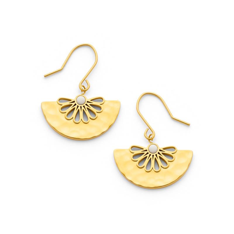 Associées au collier de la même collection, ces boucles d'oreilles en acier doré mettront un peu de lumière et de joie durant l'hiver parfois maussade. Réputée pour soulager la dépression, qui guette souvent durant l'hiver, la howlite sertie sur ces boucles d'oreilles saura veiller sur vous.