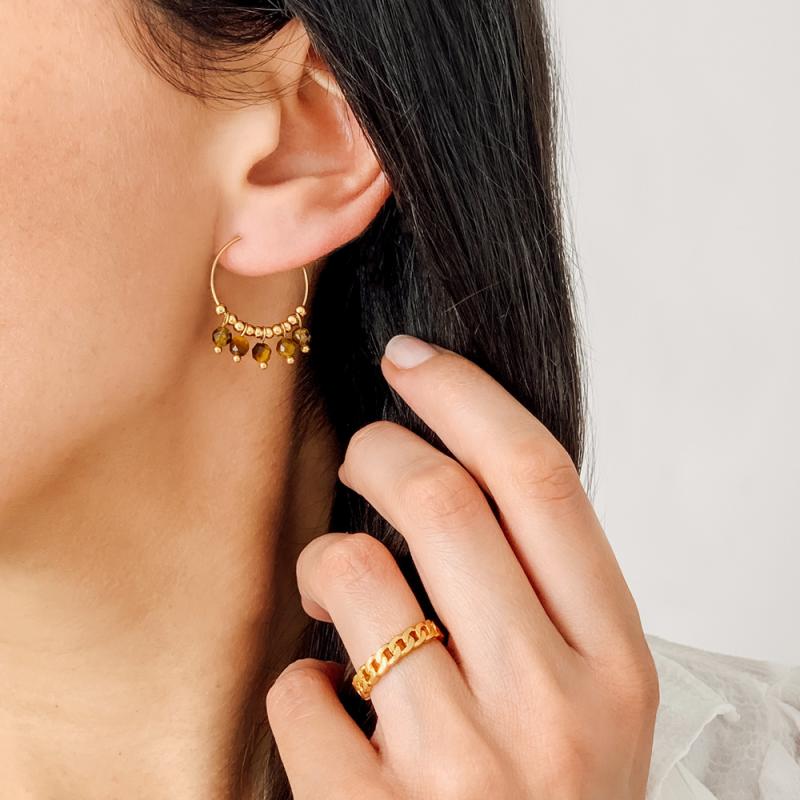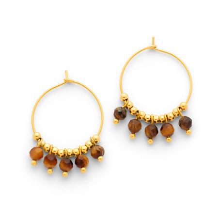 Créoles acier doré avec oeil de tigre diamètre 20 mm