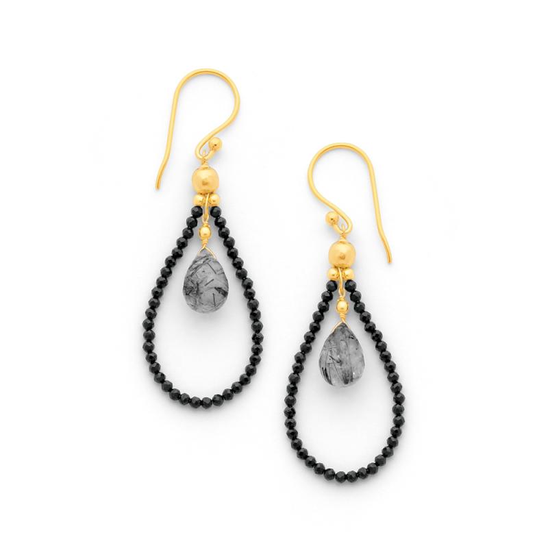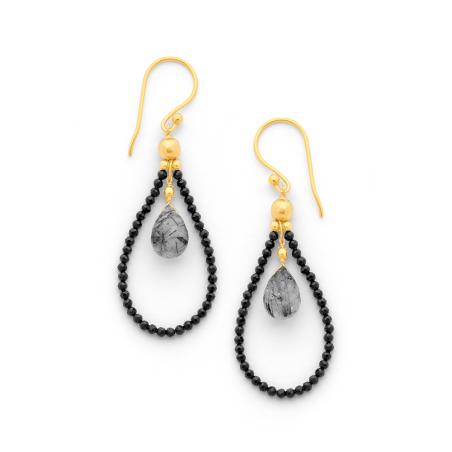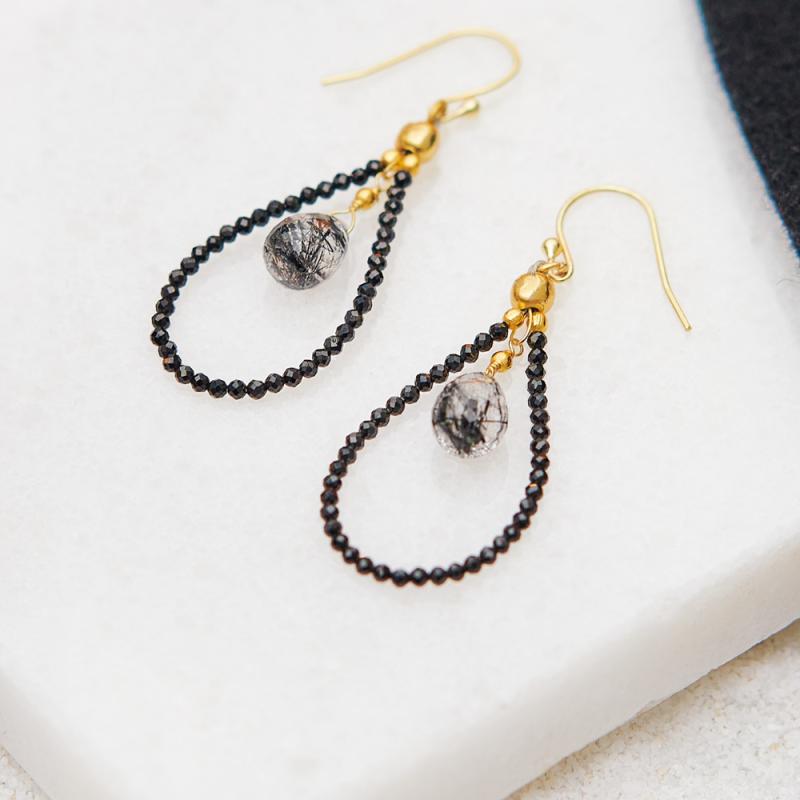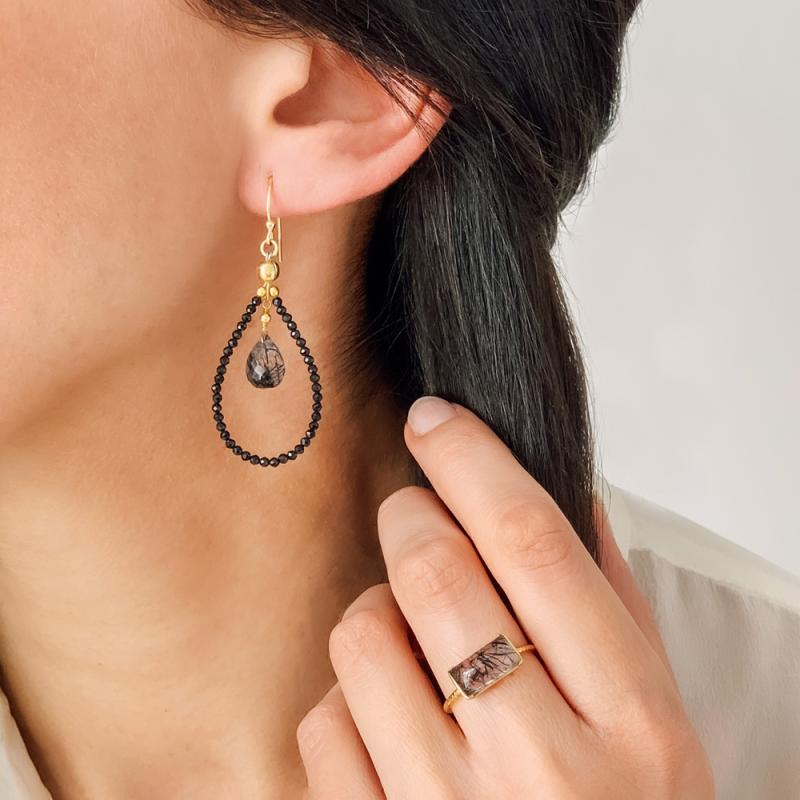 Boucles d'oreilles acier doré avec quartz rutilé et spinelle noire