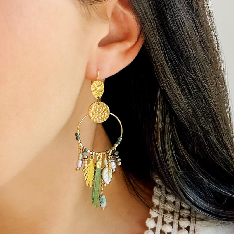 Dormeuses acier doré, amazonite,hématite et perles de culture