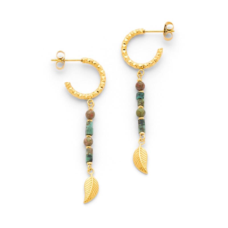 Créoles acier doré avec turquoise africaine et unakite