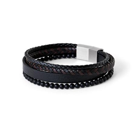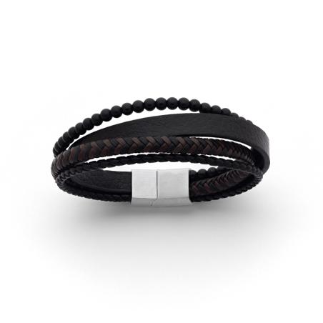 Bracelet acier avec croûte de cuir et agate noire réglable 20 à 21 cm