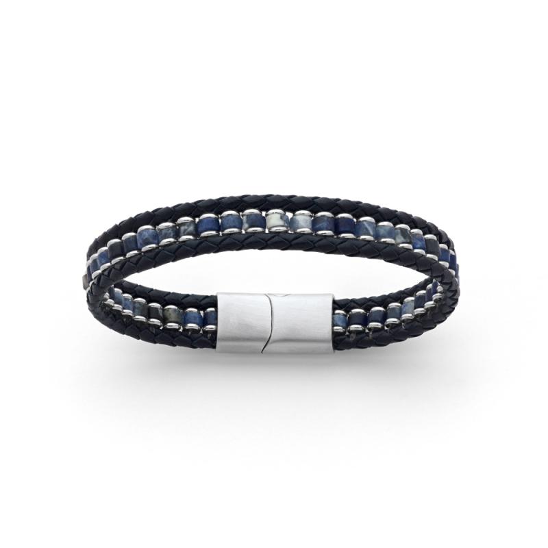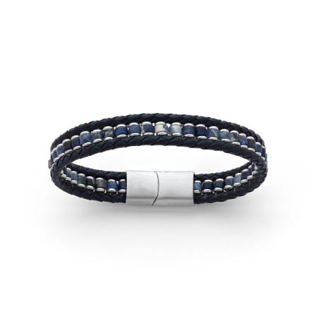 Bracelet acier avec croûte de cuir et sodalite réglable de 20 à 21 cm
