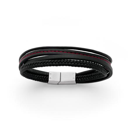 Vous êtes à la recherche dun accessoire unique, à porter au quotidien ? Ce bracelet en acier et croûte de cuir est idéal pour révéler votre caractère masculin. Les différents cordons en cuir noir assortis ainsi que la surpiqûre rouge lui confère un look très contemporain. Le fermoir en acier permet dajuster le bracelet à votre poignet de 20.5 à 21.5 cm.