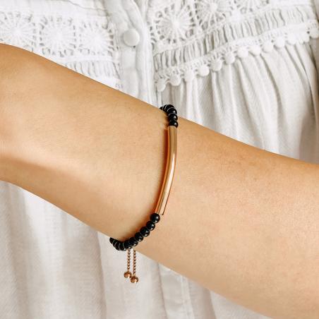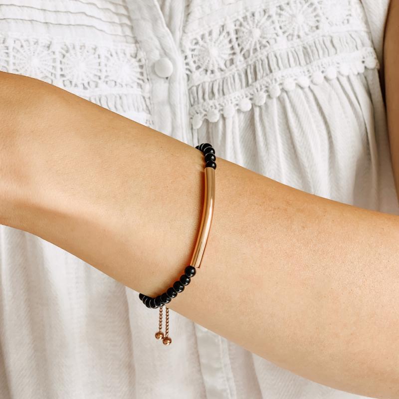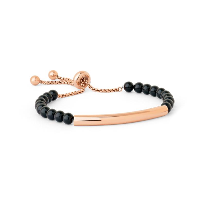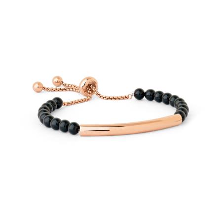 Agrémentez votre poignet avec ce bracelet en acier rose. La jolie plaque en acier rose entourée de perles en agate noire est du plus bel effet. Les deux couleurs de ce bracelet vous permettront de le porter au quotidien avec toutes vos tenues. Ce bracelet de la collection Vœux est long de 24 cm, ajustable grâce à son fermoir coulissant.