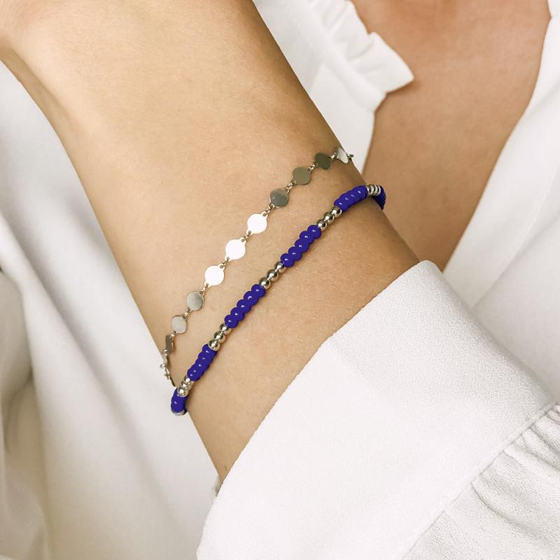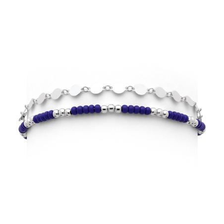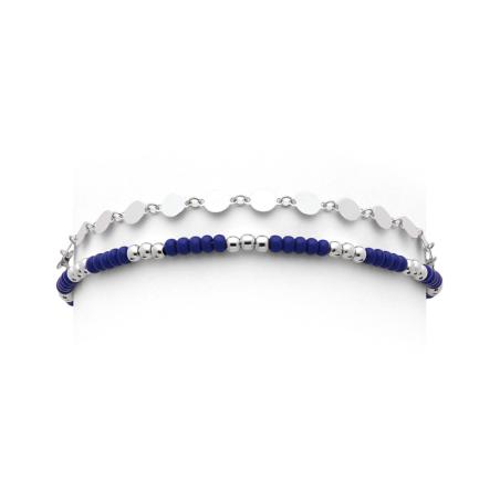 Atypique ce bracelet en argent propose deux rangs complètement différents et pourtant parfaitement associés l'un mettant en valeur l'autre et inversement. Le premier rang se compose d'une succession de pastilles brillantes en argent tandis que le second est formé par une multitude de perles en argent et en cristal bleu. Ce bracelet est réglable de 16 à 19,5 cm.