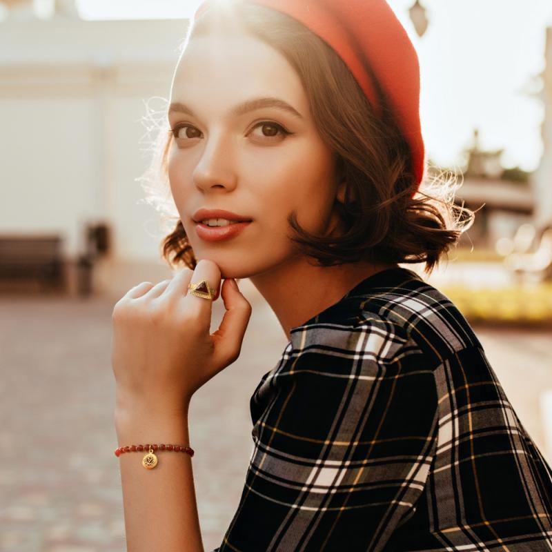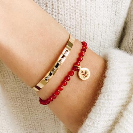 La couleur orangée des perles d'agate de ce bracelet de la collection Lotus, donne des envies d'aventure au milieu de la savane à observer la faune et la flore. Devenez une vraie aventurière avec ce bracelet en acier jaune et agate. Ce bracelet est ajustable pour s'adapter à tous les poignets.