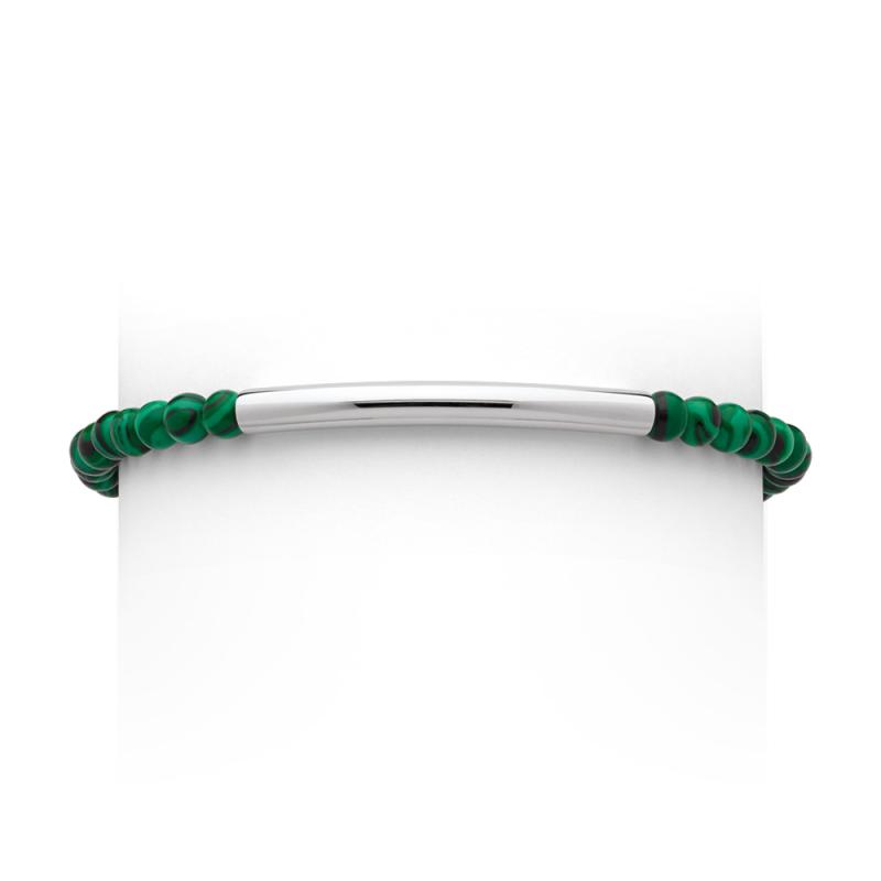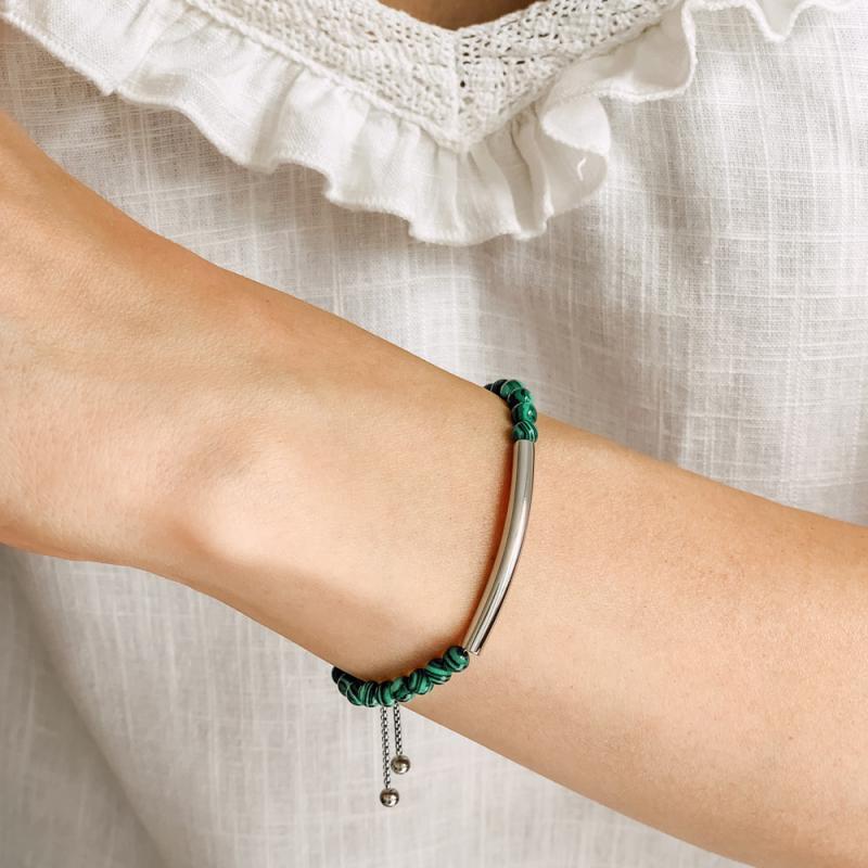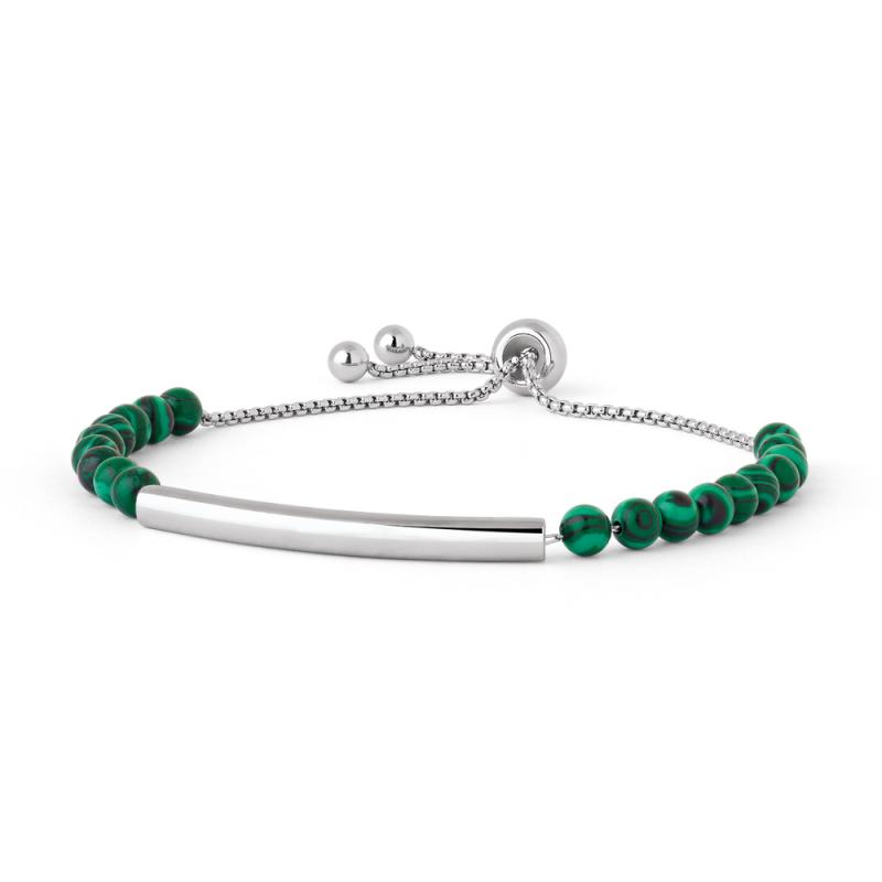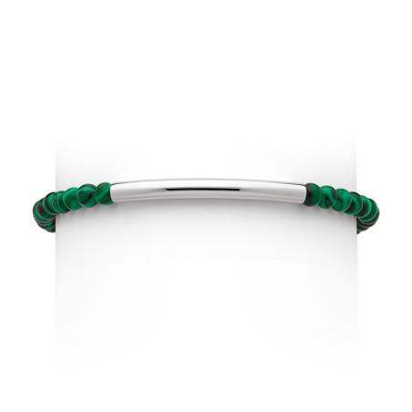 Le vert profond veiné de noir de la malachite rend chaque pierre unique. Sur ce bracelet de la collection Souhait aucune pierre ne se ressemble et pourtant l'ensemble est parfaitement harmonieux. L'acier brillant associé à la couleur de la malachite rend ce bracelet éclatant de fraicheur. Il est ajustable de 16 à 20 cm.