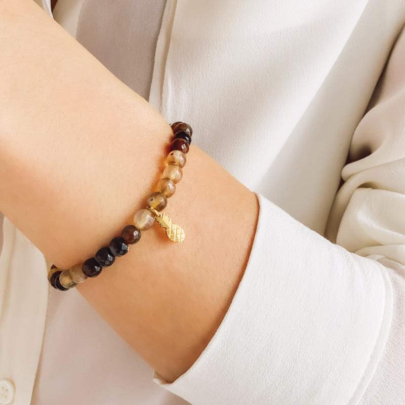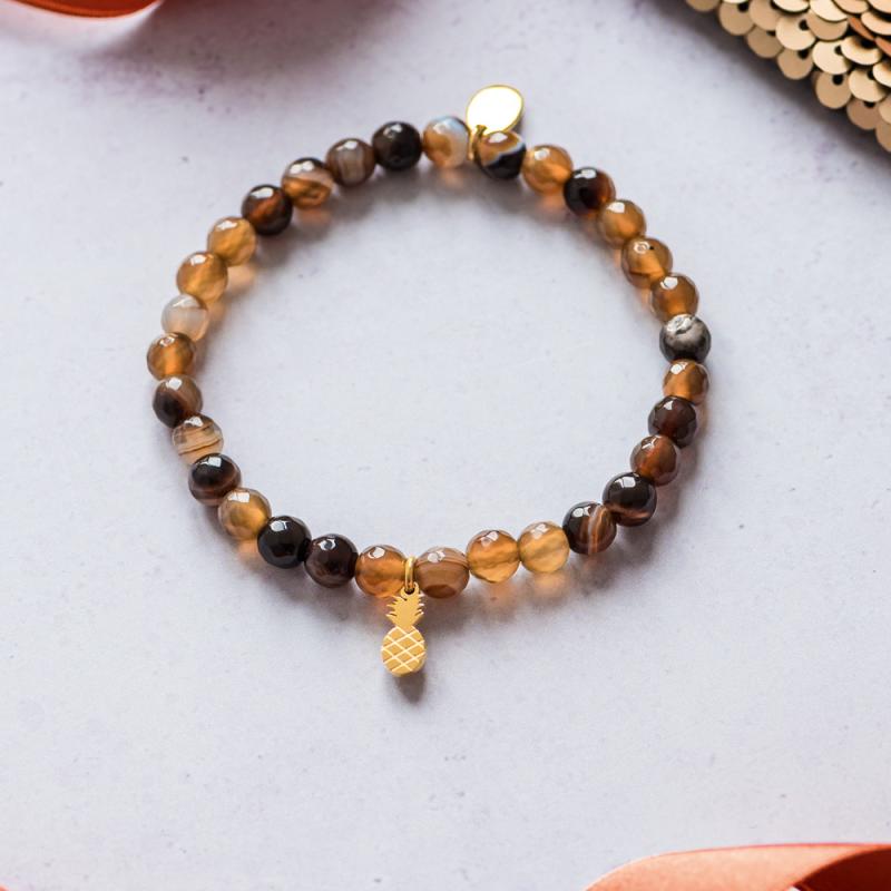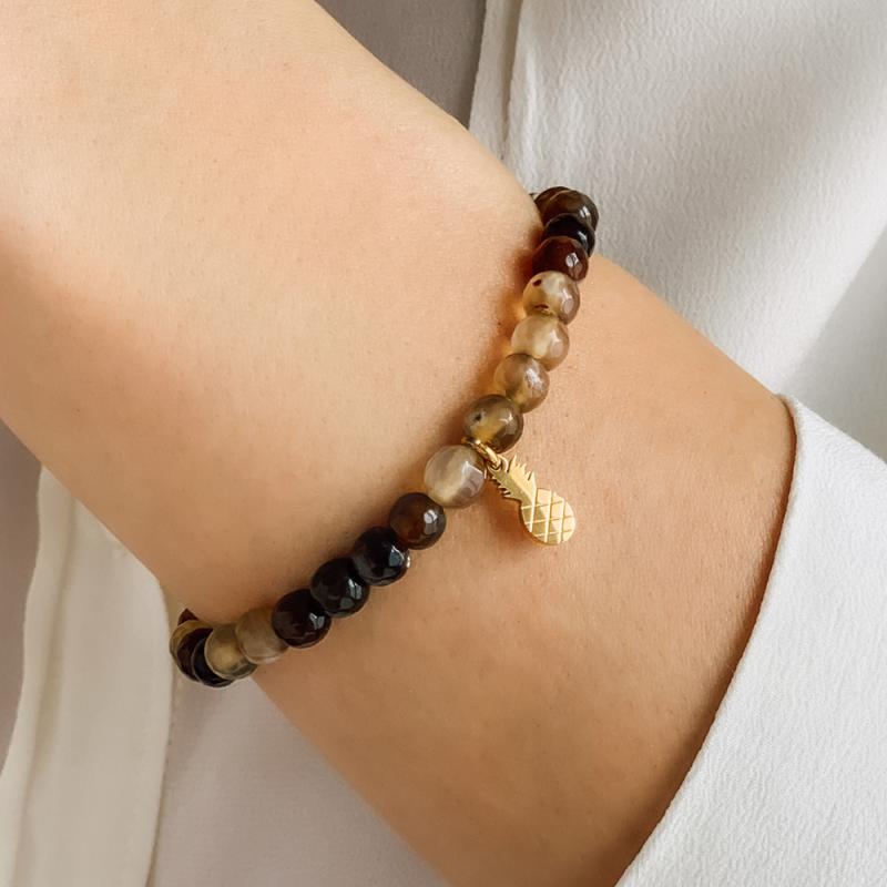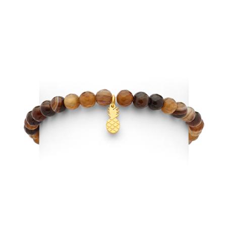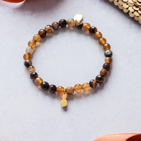 La couleur des agates de ce bracelet en acier jaune rappelle les tons de la forêt tropicale où les fruits gorgés de soleil et de sucre sont pléthore. La breloque en forme d'ananas de ce bracelet s'associe parfaitement à l'ensemble pour une évasion garantie. Ce bracelet est monté sur un élastique pour s'adapter à tous les poignets.