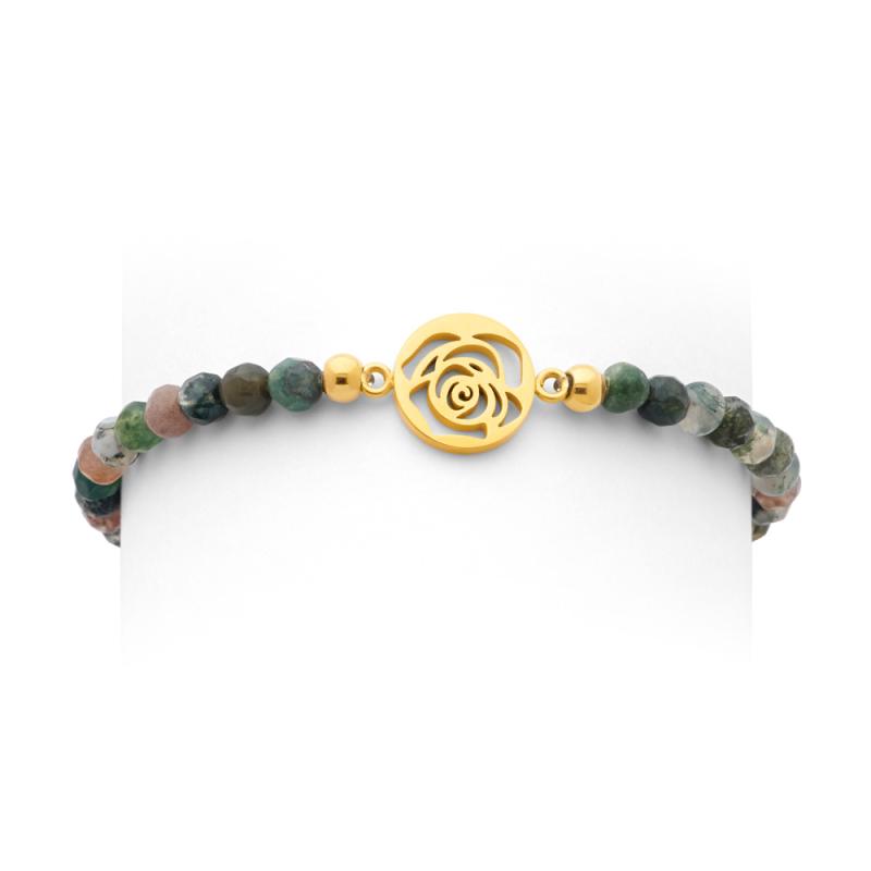 Une belle rosace en acier doré trône fièrement au centre de ce bracelet composé d'une multitude de perles d'agate toutes d'une couleur différente pour un ensemble harmonieux. Les perles sont montées sur un élastique, ainsi ce bracelet s'enfile facilement et s'adapte à tous les tours de poignet.
