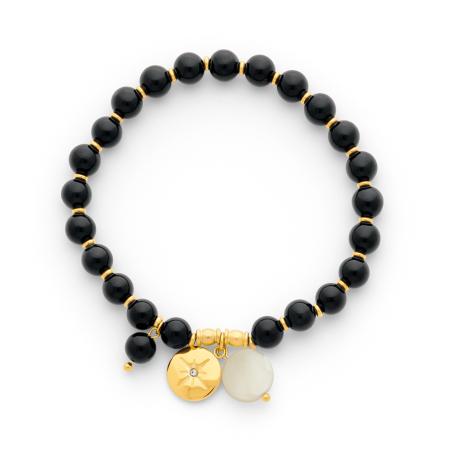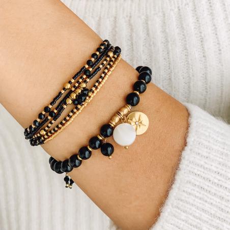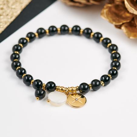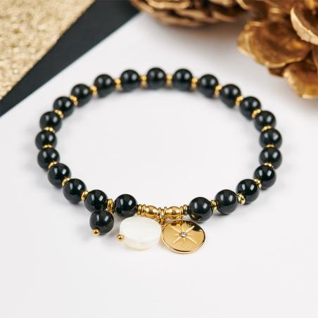 Bracelet élastique acier doré avec zirconia, agate noire et nacre