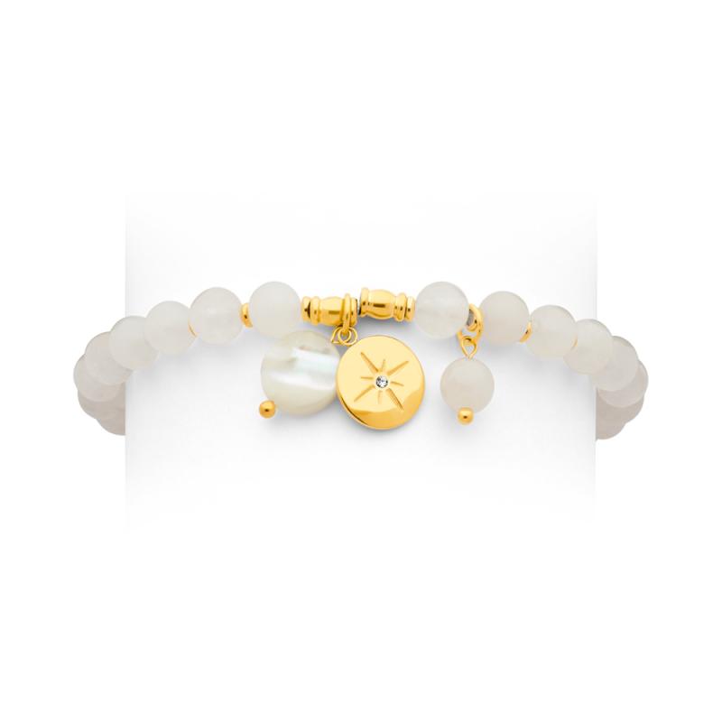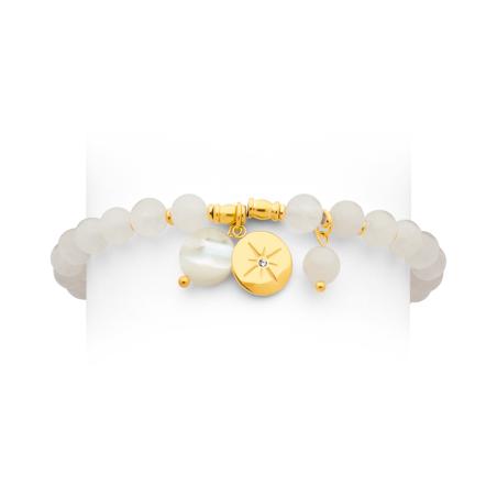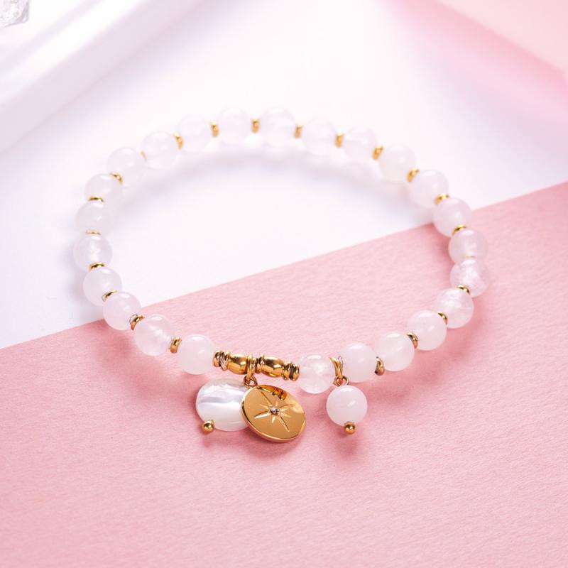 Bracelet élastique acier doré avec zirconia, quartz blanc et nacre