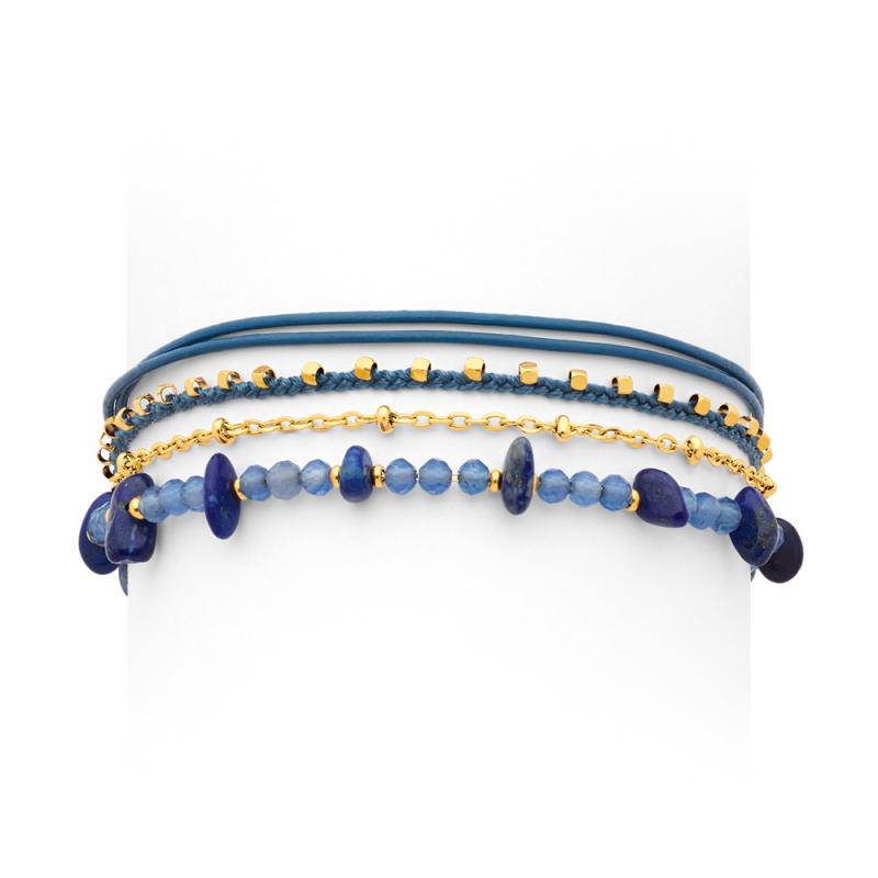 Bracelet acier doré, lapis,agate et croûte de cuir réglable 16 à 19cm