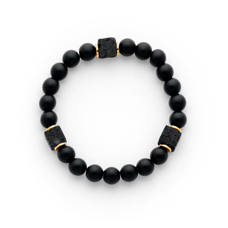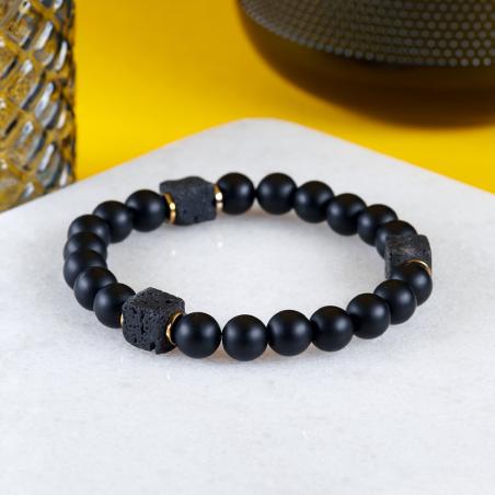 Bracelet acier doré, agate noire mate,pierre de lave sur élastique