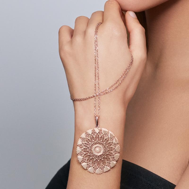 Ce collier sautoir en acier rose de la collection Mandala est l'accessoire indispensable pour avoir une belle allure. Il est rehaussé d'un pendentif de forme ronde avec motif qui met en valeur votre buste avec originalité et élégance. Ce sautoir de 70 cm accompagnera les femmes de caractère.