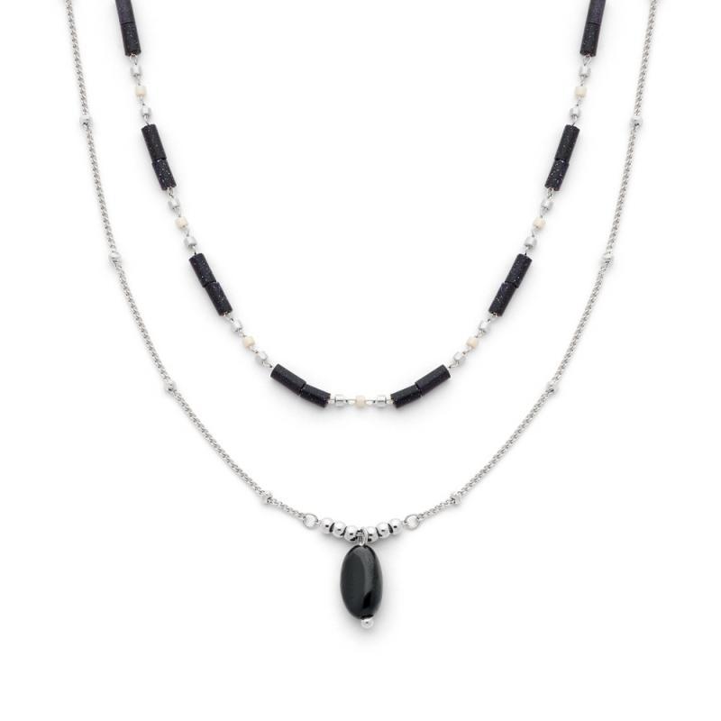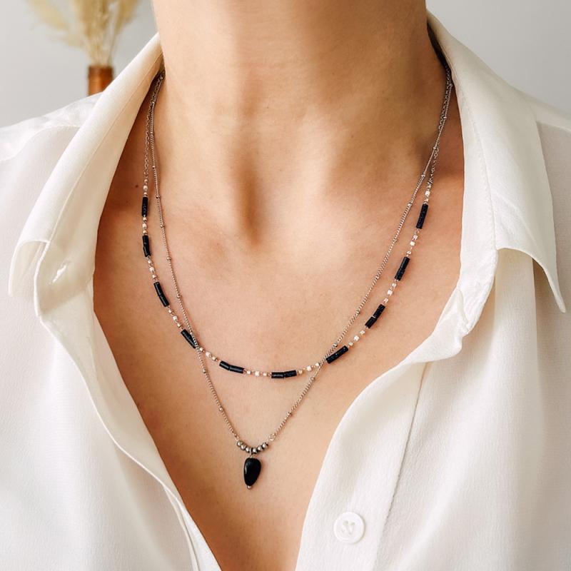 Collier double acier avec agate noire réglable de 43 à 48 cm