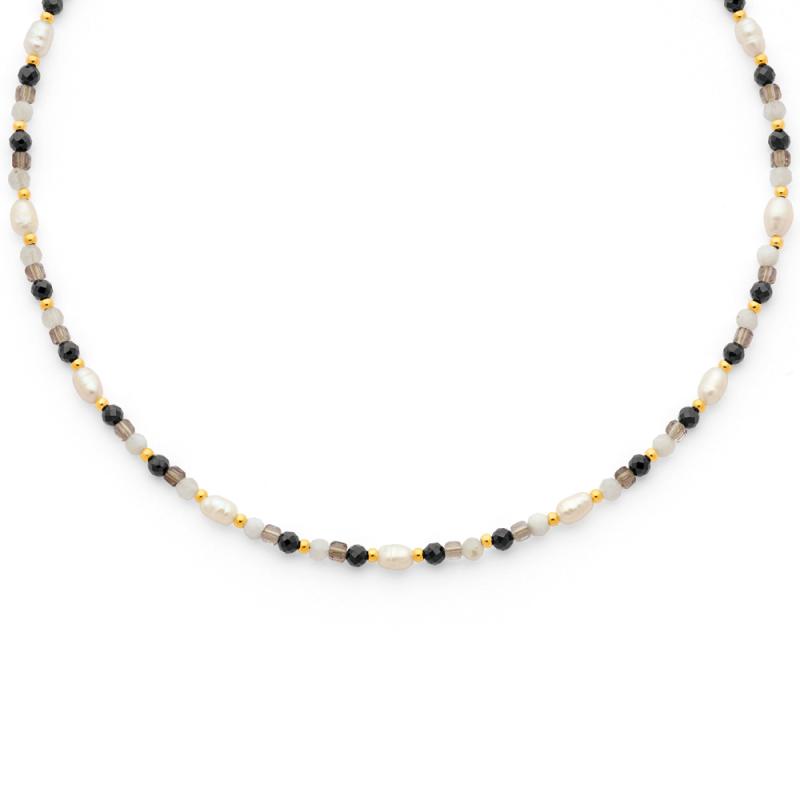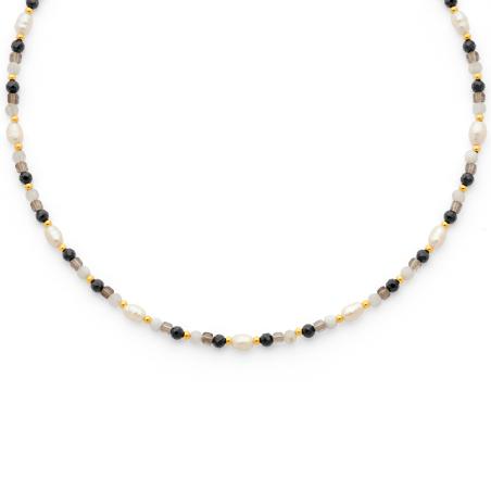 Collier acier doré, spinelle noir et quartz fumé réglable 40 à 45 cm