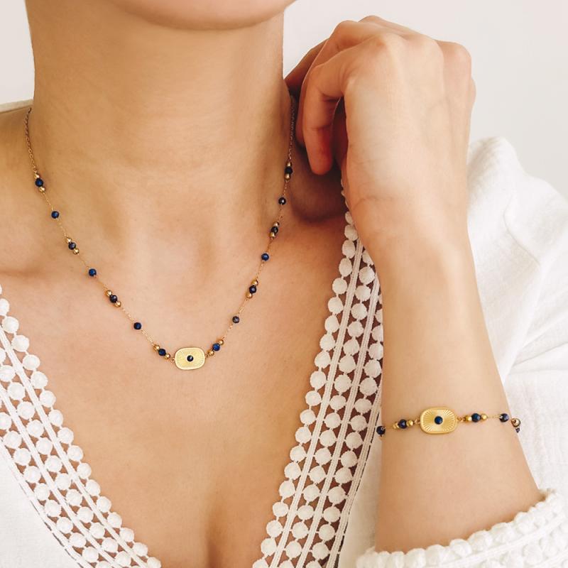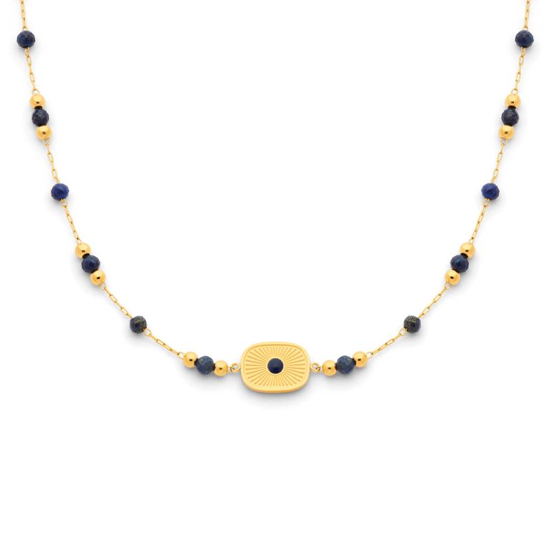 Collier acier doré avec lapis lazuli et émail réglable de 40 à 45 cm