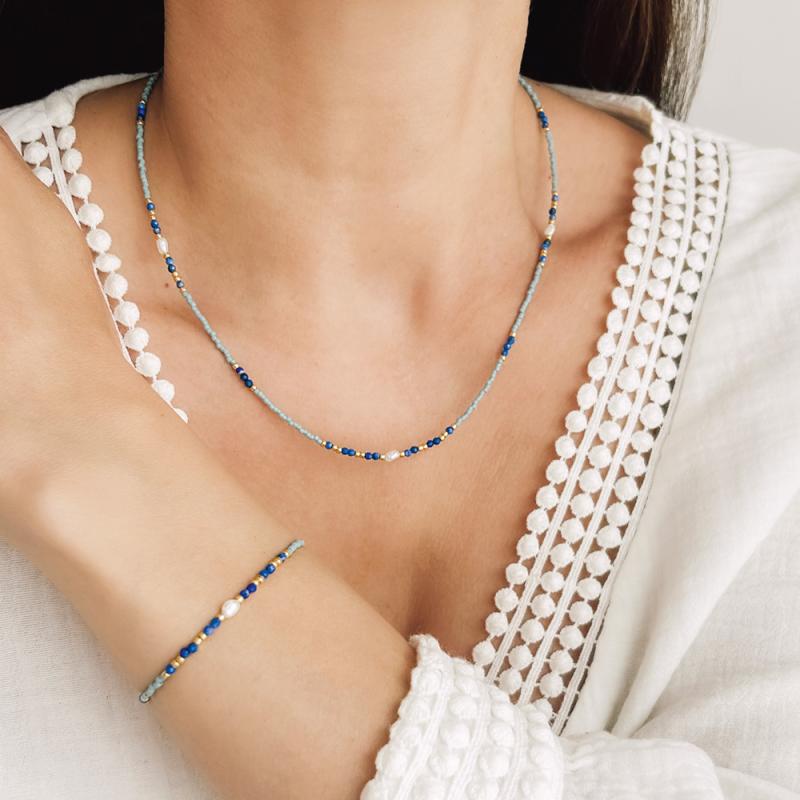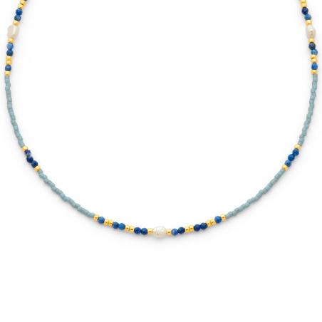 Collier acier doré, lapis, miyuki, perles de culture, 39 à 44 cm