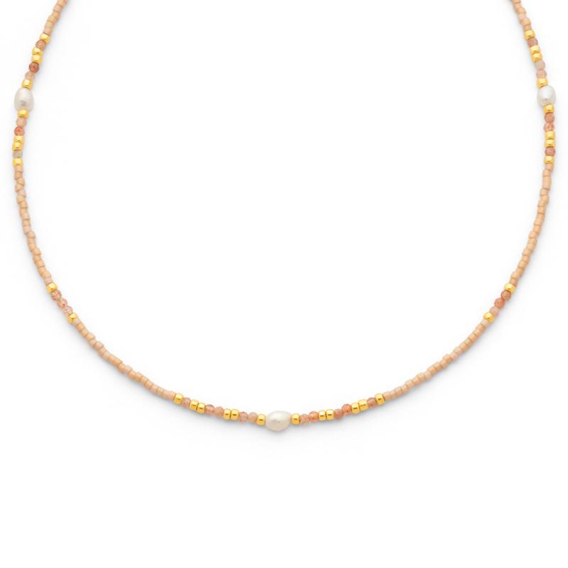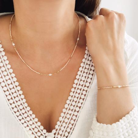 Collier acier doré, perles, pierre du soleil réglable de 39 à 44 cm
