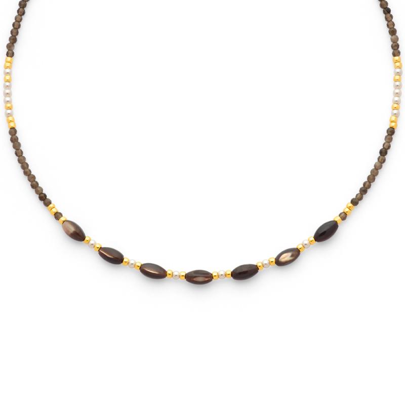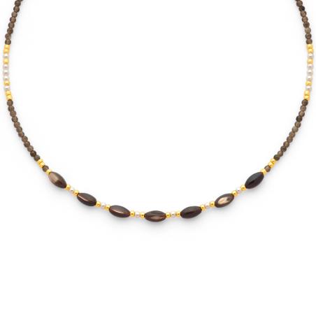 Collier acier doré, obsidienne argentée, nacre réglable de 16 à 19 cm