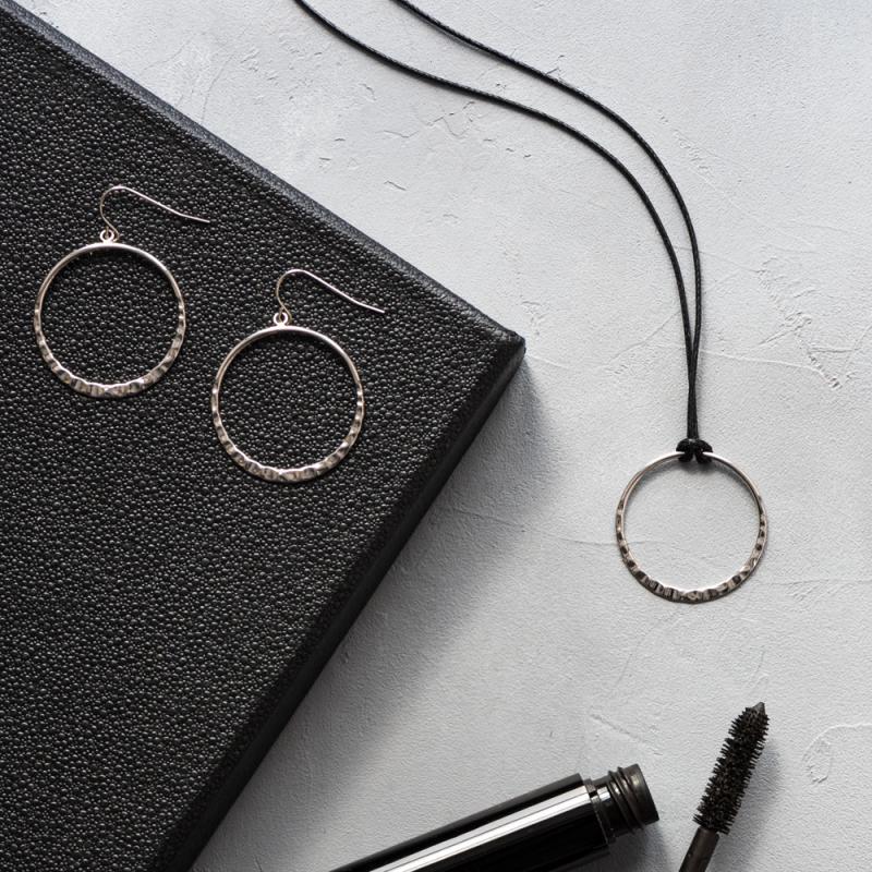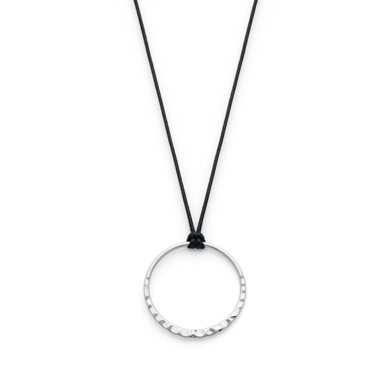 Ce collier se compose d'un cordon noir en coton et d'un pendentif en forme de cercle en acier martelé. Ce bijou de la collection Simplicité offre un contraste saisissant entre les deux matières. Il saura s'adapter quelle que soit la tenue que vous aurez choisie. La longueur de ce collier est réglable de 40 à 45 cm.