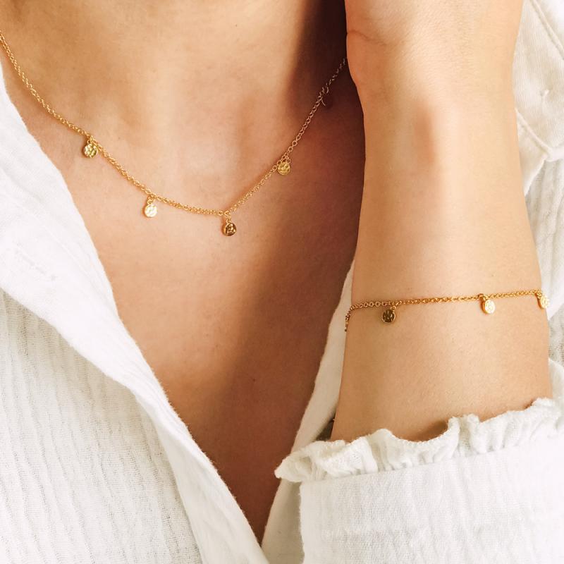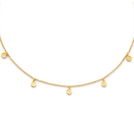 Finesse et sobriété caractérisent ce collier doré de la collection Aya. Les pastilles martelées suspendues sur la fine chaîne refléteront la lumière chatoyante du soleil pour un effet joyeux. Ce collier peut s'ajuster de 40 à 45 cm. Pour un ensemble complet, portez-le avec le bracelet assorti.