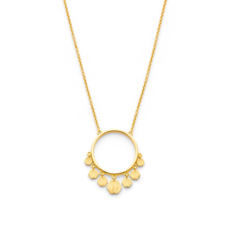Osez le style bohème avec ce collier doré de la collection Paloma. Les pampilles de l'anneau central de ce collier réfléchiront la lumière du soleil pour un effet étincelant. Idéal en cadeau ou pour se faire plaisir, ce collier flattera votre décolleté. Sa longueur est réglable de 40 à 45 cm.