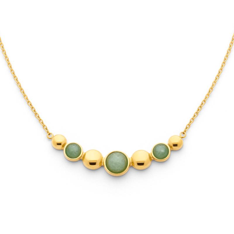 L'aventurine est à l'honneur sur ce collier en acier doré de la collection Zoé. Le motif central composé de 3 aventurines séparées par des ronds en acier jaune est d'un beau volume et se fera remarquer. La chaîne de ce collier peut être réglée de 40 à 45 cm de longueur.
