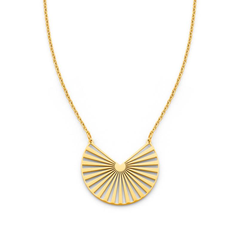 Avec sa forme qui laisse penser aux rayons du soleil, ce collier en acier doré vous transportera vers des horizons lointains où le climat est toujours clément. En portant ce collier, votre gaieté sera communicative. Ce collier peut se porter en ras du cou à même la peau ou légèrement plus long sur une blouse ou un pull.