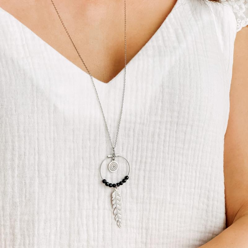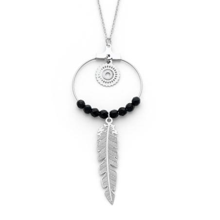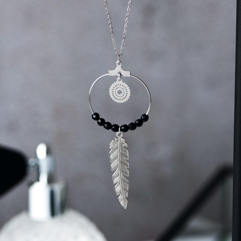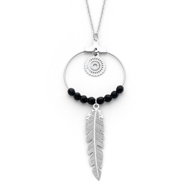 Sautoir acier avec agate noire réglable de 70 à 75 cm