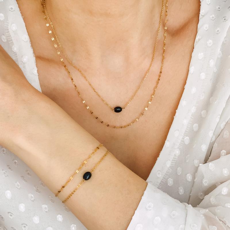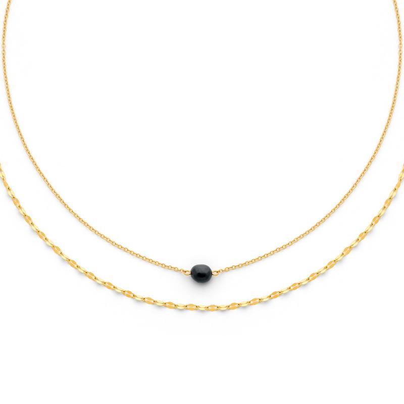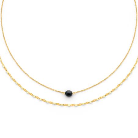 Collier double acier doré avec agate noire réglable de 40 à 45 cm