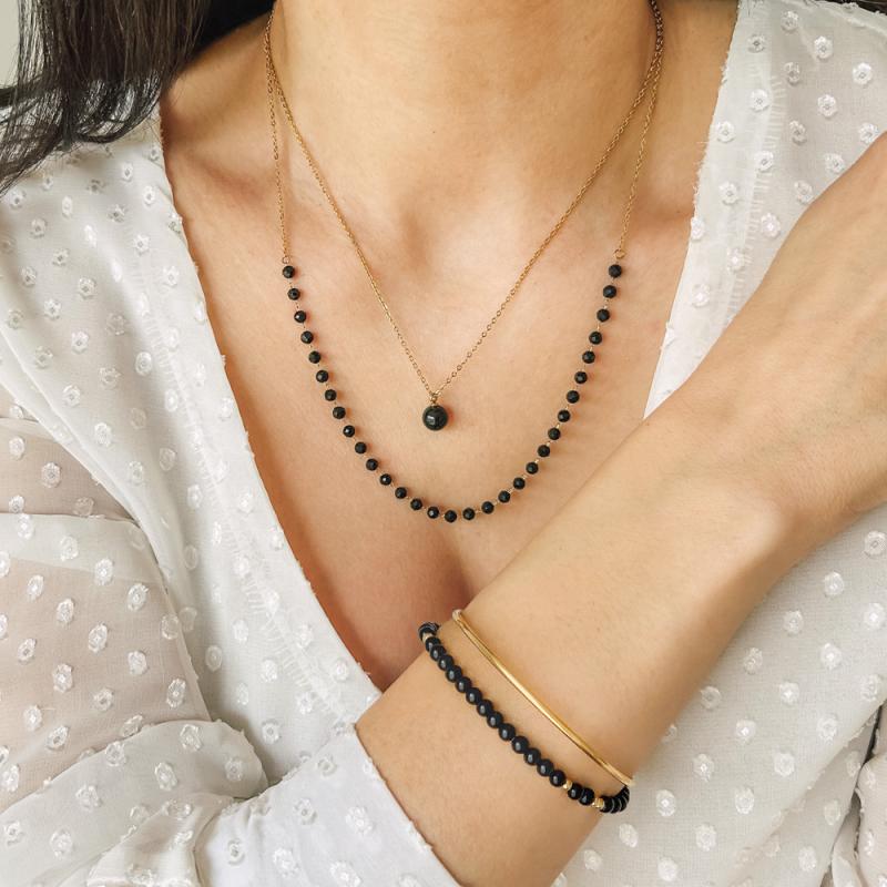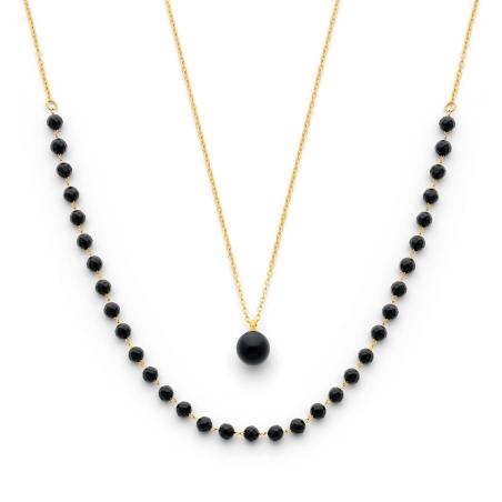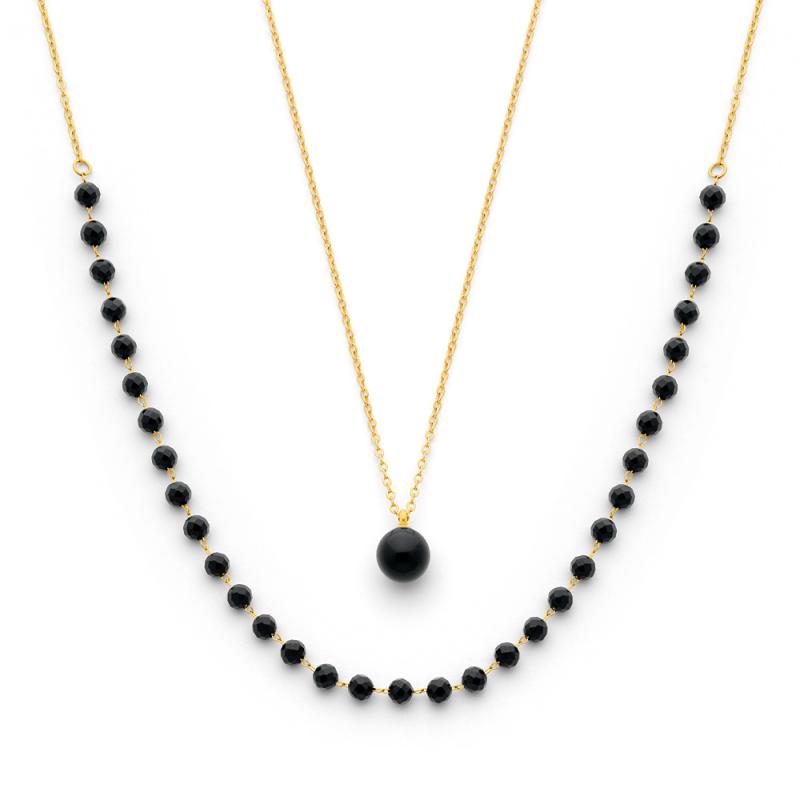 Collier double acier doré avec agate noir réglable de 40 à 45 cm
