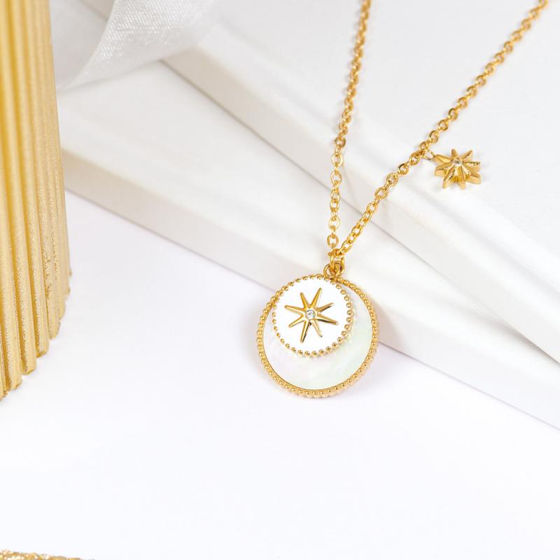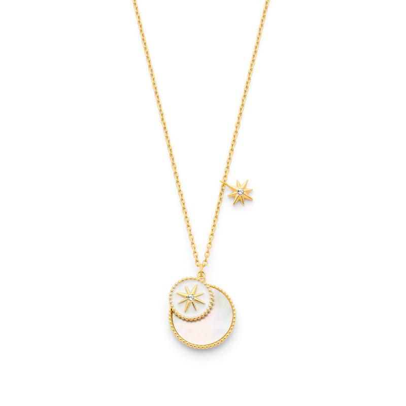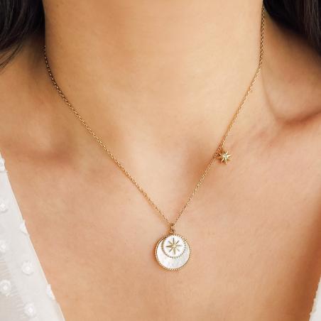Collier acier doré, nacre, émail et cristal réglable de 40 à 45 cm