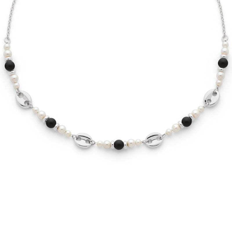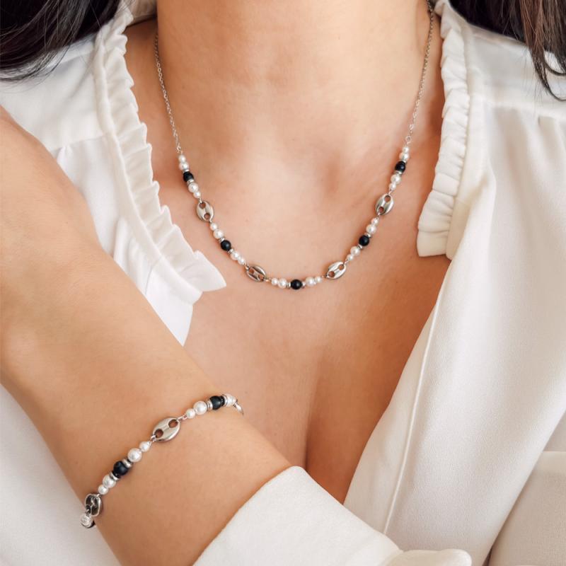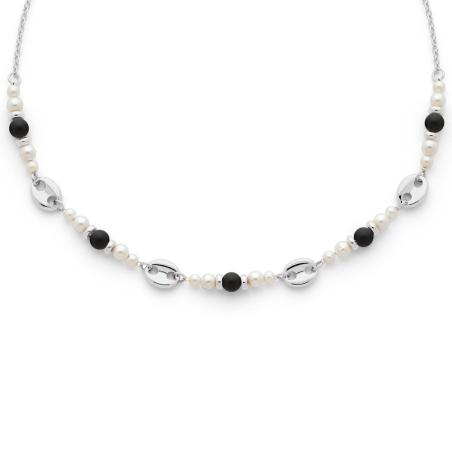 Collier acier avec agate noire mate nacre réglable de 40 à 45 cm