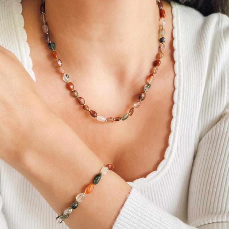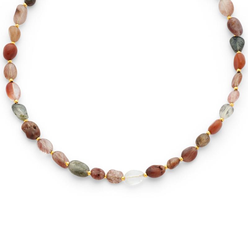 Collier acier doré quartz rutilé multicolore réglable de 41 à 46 cm