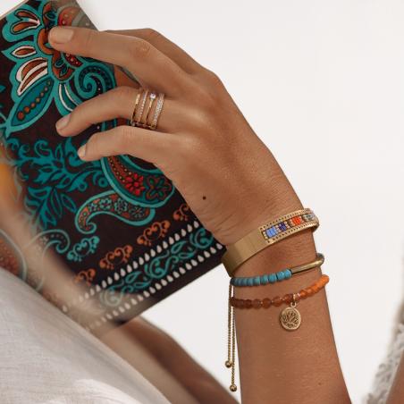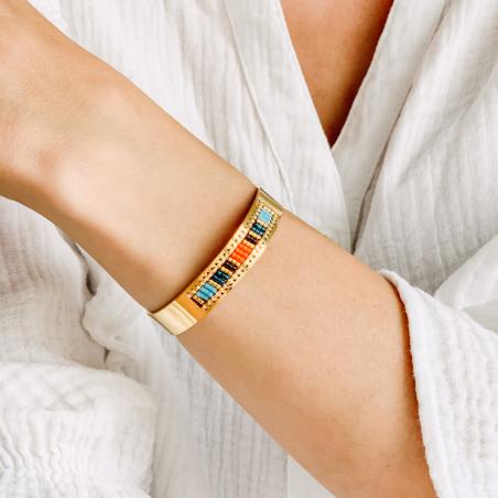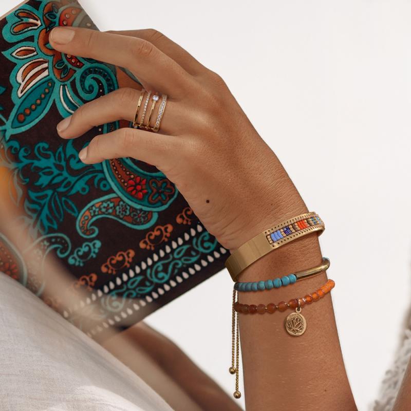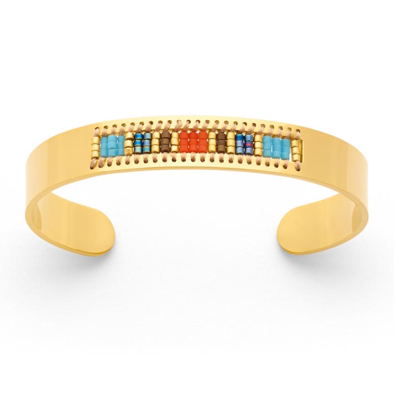 Optez pour la gaieté avec ce bracelet en acier jaune de la collection Gaia. Ce bracelet rigide ouvert donne l'illusion d'un métier à tisser où les perles en verre teinté sont placées en fonction de leur couleur pour un rendu étonnant. Ce bracelet ouvert est disponible en de 60 mm de diamètre.