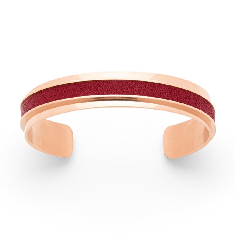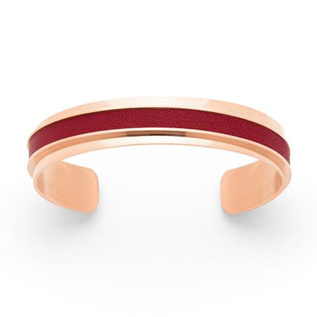 Aujourd'hui la bijouterie se fait insolente et se permet toutes les originalités pour notre plus grand bonheur. Associer la croûte de cuir et l'acier rose il fallait y penser ! Ce bracelet vous rendra spéciale et vous permettra d'affirmer votre esprit non conformiste. Cette manchette ouverte fait 60 mm de diamètre.