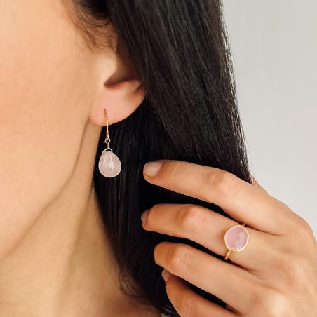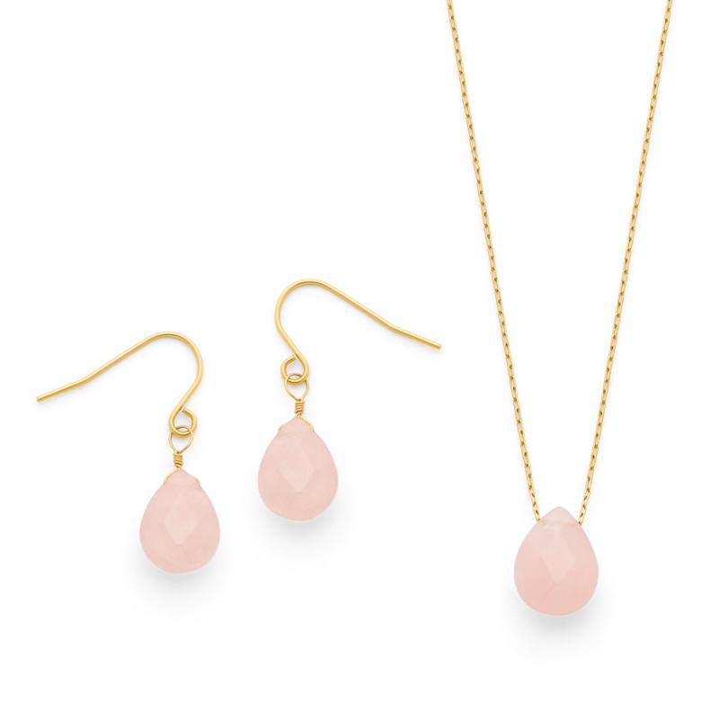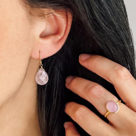 Ensemble collier et boucles d'oreilles acier doré avec quartz rose