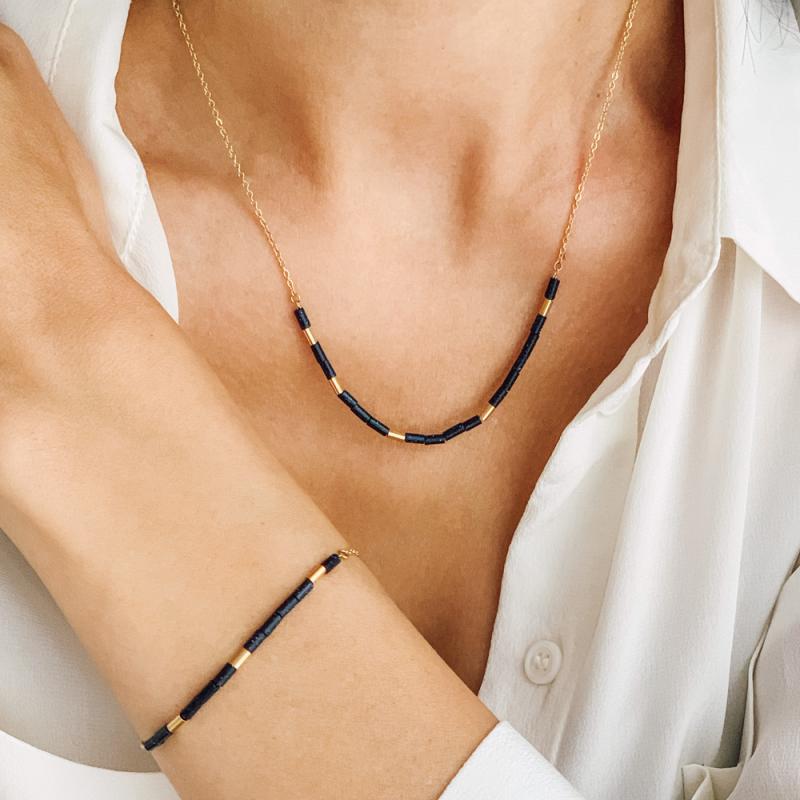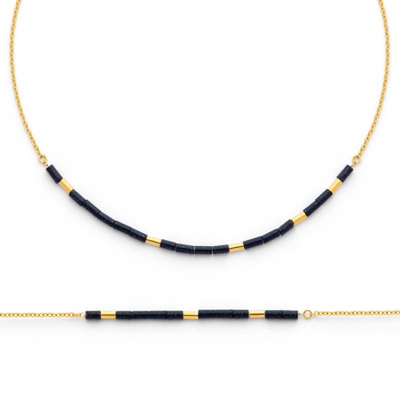 Ensemble collier et bracelet acier doré avec pierres de sable bleu
